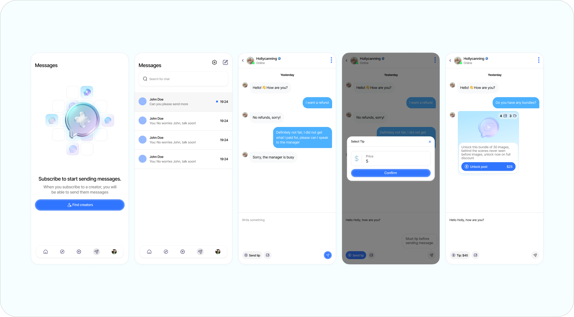 Creator discovery with filterable search across social metrics, audience demographics, niche, and engagement rates. Brand dashboard with multi-campaign management, spend tracking, performance metrics, and team collaboration. Real-time messaging between brands and creators with file sharing and contract management.